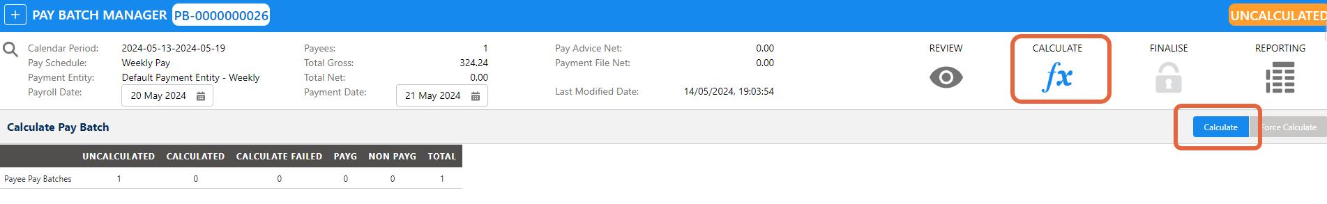 - After the pay batch has been reviewed in review a pay batch, go to the Calculate tab.