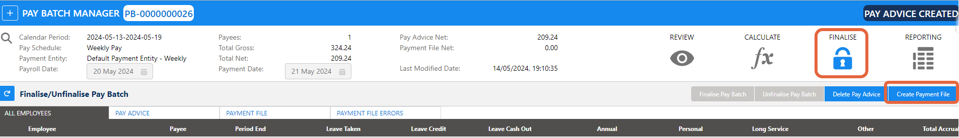 If you would like to make an adjustment after the payment file has been created and and would like the adjustment to be a part of this pay batch, you must undo the steps by clicking Delete Payment File, then Delete Pay Advice, and finally Unfinalise Pay Batch. If you do not undo the steps, any adjustments made as part of this pay batch will be picked up in the next pay batch.